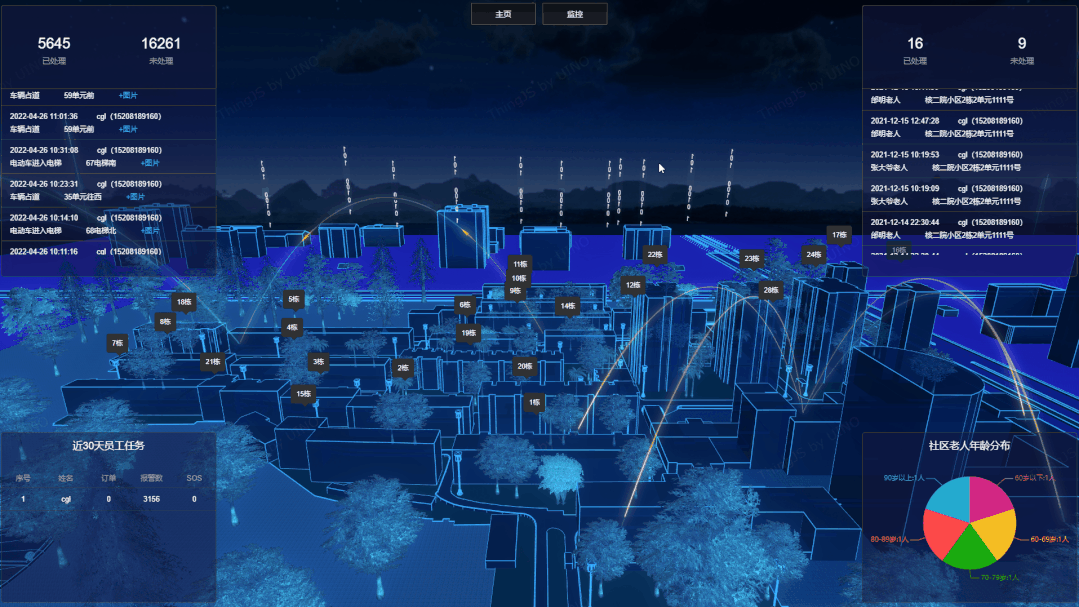 在如今万物皆“智”的时代,社区作为城市治理的最后一公里,打造智慧社区成为城市建设发展的新趋势。智慧社区所提供的功能和服务主要体现在社区管理、社区服务以及家庭服务这几大模块上,其中,社区管理包含智慧社区中最为关键的智能安防和智慧物业的部分。 基于 ThingJS 数字孪生可视化开发平台开发的智慧社区可将社区安防系统及物业管理高效结合,为用户提供一个可以统一管理、实时感知、系统联动、实时分享的平台,一个系统即可支持社区安防、物业管理、社区服务等应用场景。 使用 ThingJS 低代码数字孪生可视化开发平台,实现快速搭建场景、开发应用,ThingJS 是纯H5的WebGL架构,可在各类主流网页浏览器中自如运行,包括可在移动端直接访问运行。 智慧社区运行效果 本文的智慧社区园区建筑采用了科技感风格的极简线框模型,透明化的建筑外观,通过区域边界划分,让社区内的建筑布局一目了然。 对社区来说,复杂的建模模型的数据过于庞大臃肿,绝大部分细节信息对智慧社区管理的意义不大。这样的设计能减少实施成本,有利于 Web 浏览器的呈现性能,同时也能减少不必要信息的干扰。将园区直接应用 ThingJS 效果模板即可切换场景效果,如辉光、地面波纹、向上波纹等,园区创建完成后一键灵活切换效果模板,轻松获得酷炫效果。 视频监控可视化 基于数字孪生可视化场景随时掌控区域范围内的视频画面,可助力社区物业及时发现可疑事件。针对可能出现的业主生活纠纷、高空抛物、违停占道等生活现象物业能够快速发现和解决。 事件处理可视化 图形化统计 实现价值 |